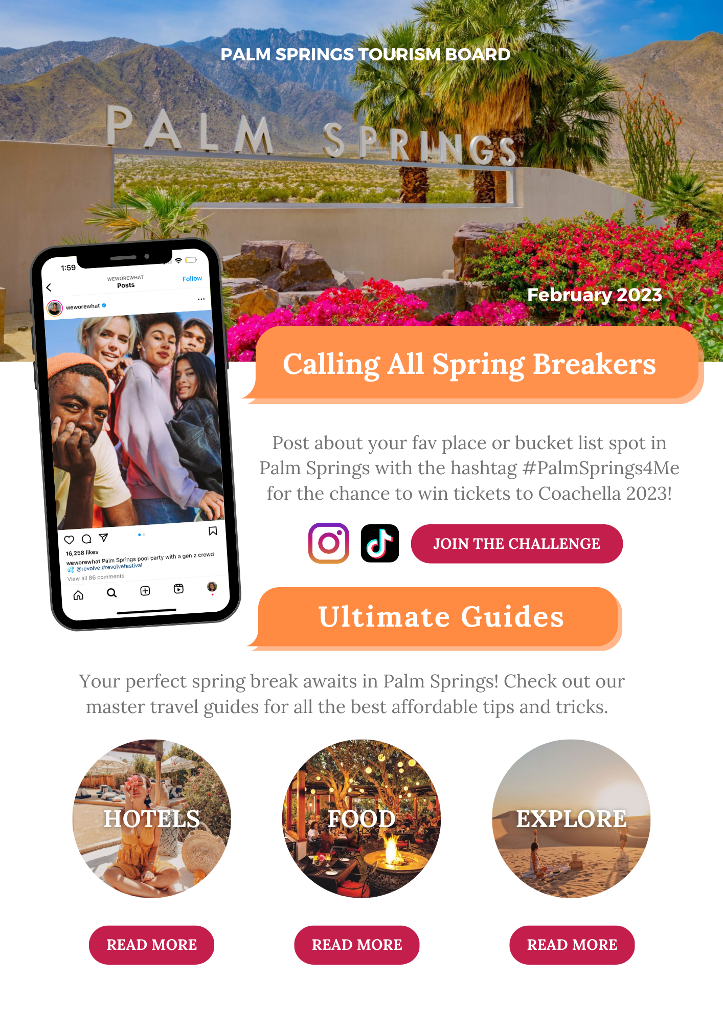 Join the fun and become part of something bigger by sharing what makes this city the right vacay spot for you. Connect with fellow spring breakers via Instagram and TikTok by posting a pic of your favorite Palm Springs spot or somewhere in the city you'd want to visit if given the chance. Make sure to add our custom hashtag #PalmSprings4Me when sharing what Palm Springs means to you for the chance to win tickets to Coachella 2023. Don't miss out!
